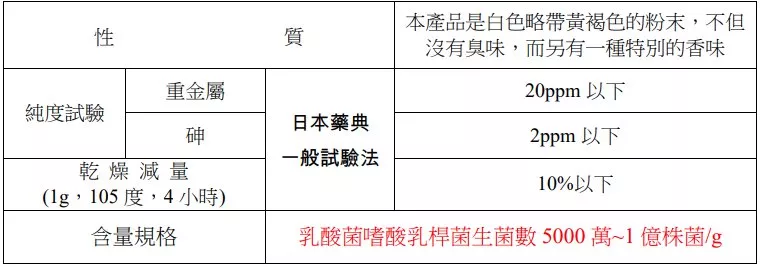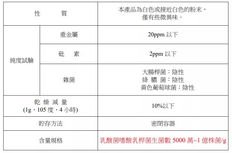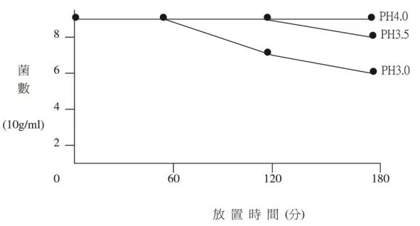 PH 值的安定性: A菌放置在已調整過PH值的檸檬酸鈉、鹽酸緩衝液於37度的條件下溶解,然後從試驗開始、60分鐘後、120分鐘後、180分鐘後菌數去測定。在PH4的溶液中就算放置了180分鐘後菌數大致上維持初期的數值,而當PH值降低時菌數也跟著減少,但減少曲線是呈現出緩和的。
